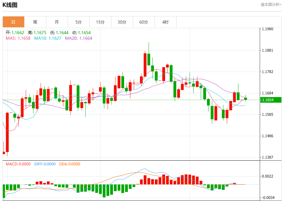 周一盘中,欧元/美元报1.1652,涨幅0.00%。