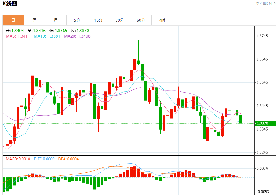周二盘中,英镑/美元报1.3385,跌幅0.14%。
