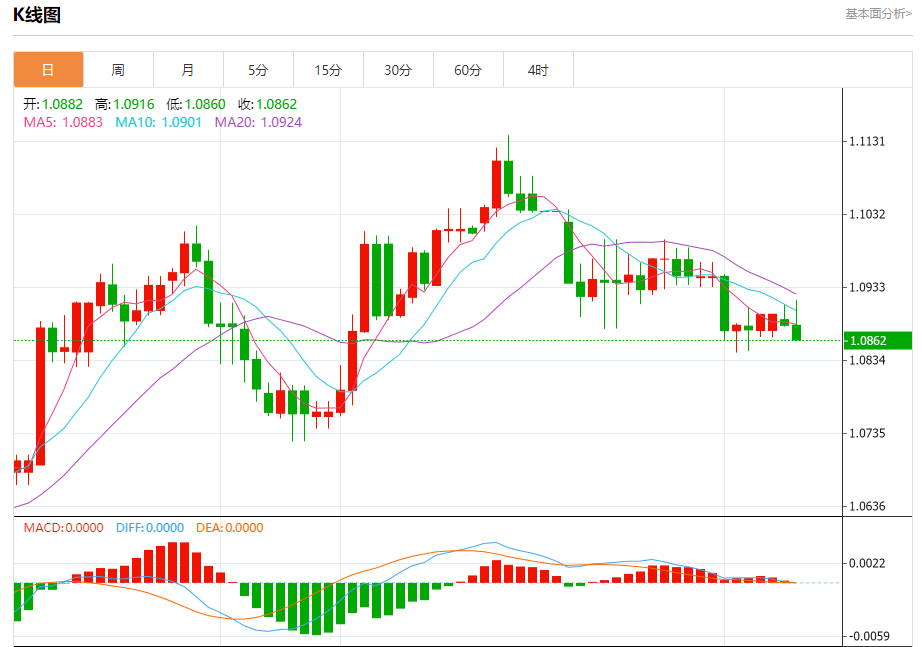 周二盘中,欧元/美元报1.0863,跌幅0.18%。