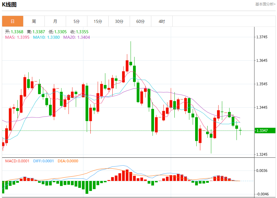 周四盘中,英镑/美元报1.3349,跌幅0.04%。