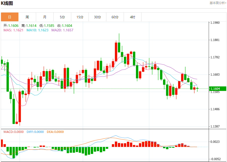 周四盘中,欧元/美元报1.1606,跌幅0.05%。
