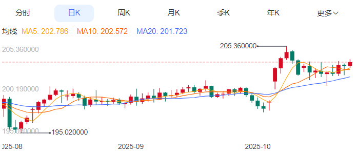 周四,英镑/日元上涨0.23%至203.48附近。