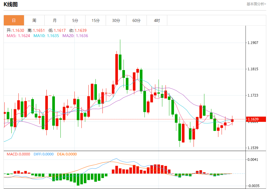 周一盘中,欧元/美元报1.1631,涨幅0.10%。