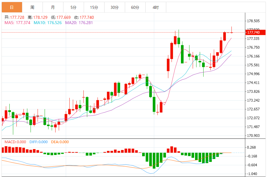 技术上,自上一期交易以来,欧元兑日元持续形成看涨走势,从178.15升至178.60。
