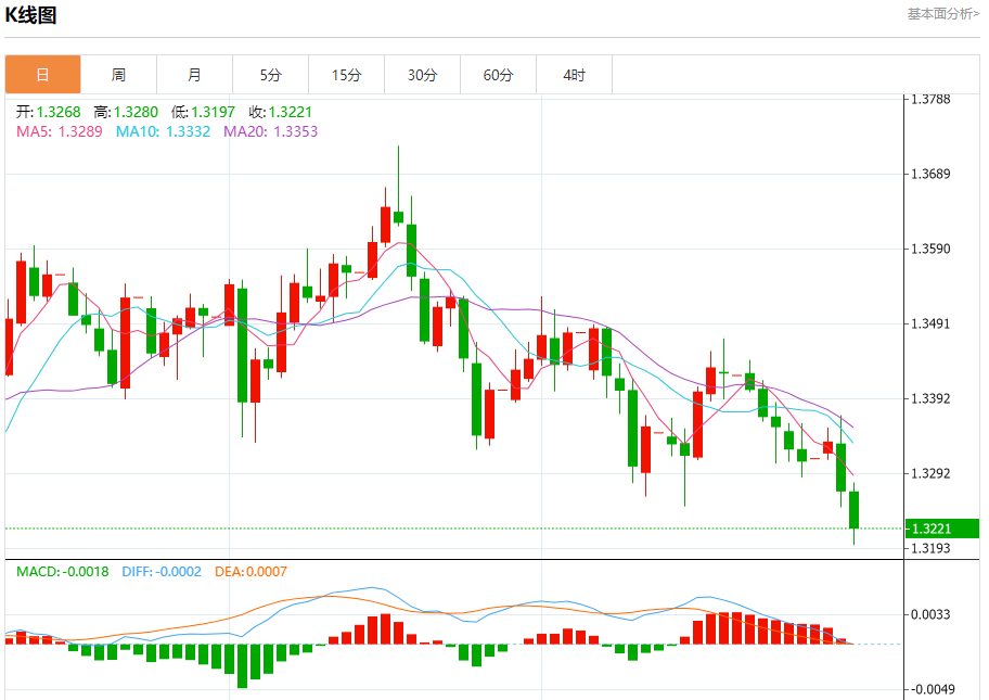 周三盘中,英镑/美元报1.3217,跌幅0.38%。