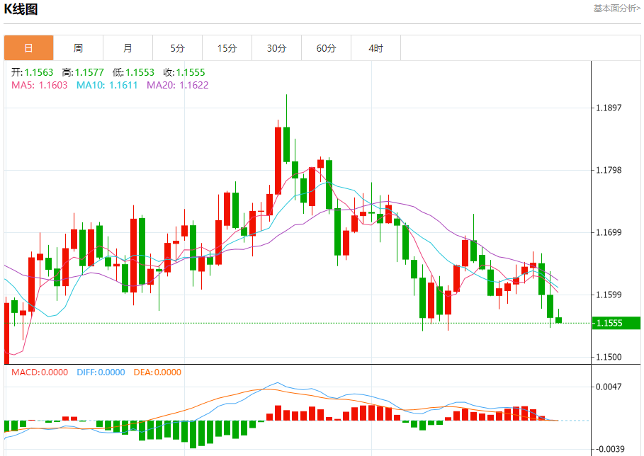 周五盘中,欧元/美元报1.1556,跌幅0.08%。