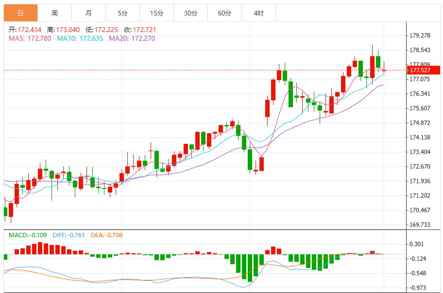 技术上,欧元兑日元保持了建议的看涨情景,尽管它未能通过在177.05提供2.00%斐波纳契延伸水平以上的重复正收盘而超过178.80水平。