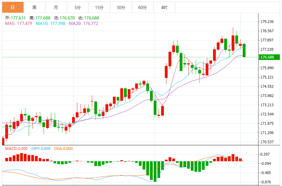 周二,欧元/日元下跌0.52%至176.747附近。