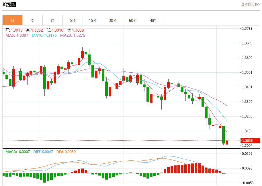 周三盘中,英镑/美元报1.3044,涨幅0.18%。