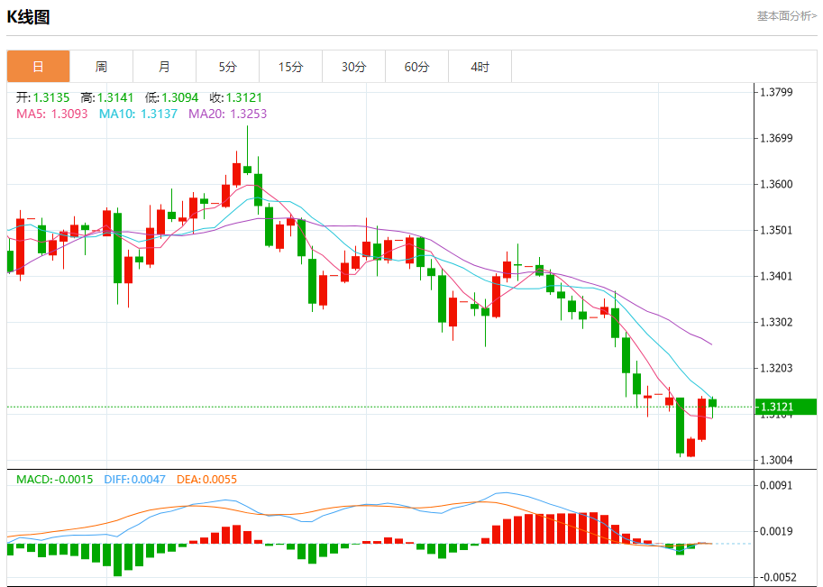 周五盘中,英镑/美元报1.3115,跌幅0.16%。