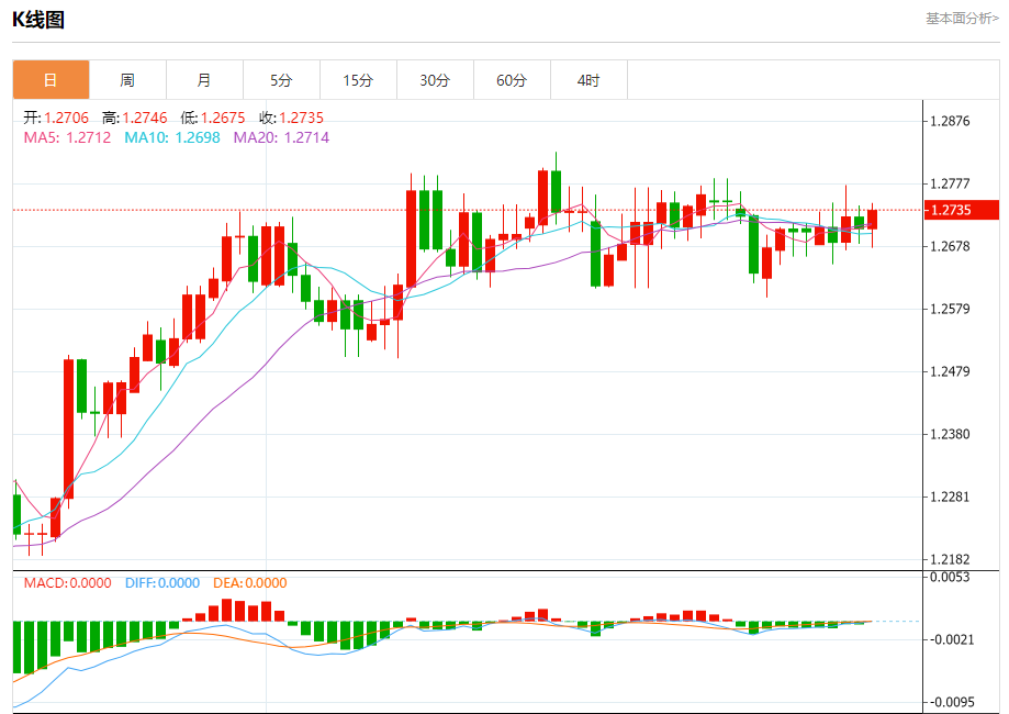 周五盘中,英镑/美元报1.2736,涨幅0.23%。