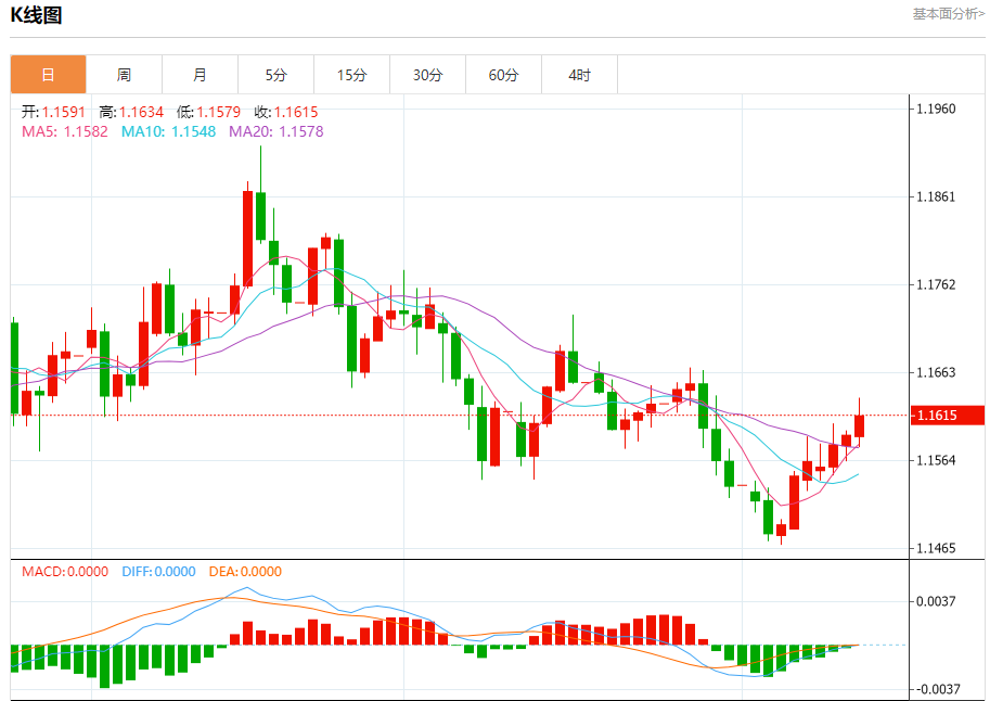 周四盘中,欧元/美元报1.1617,涨幅0.22%。
