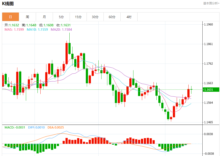 周五盘中,欧元/美元报1.1637,涨幅0.04%。