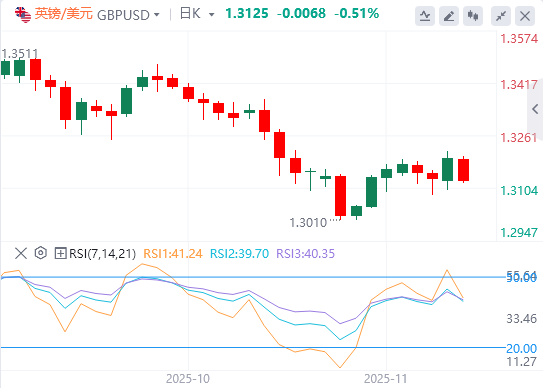 11业主14日,英镑周五表现不佳,回吐了一天前的所有涨幅,本周收盘时似乎将小幅下跌。英国《金融时报》(FT)报道称,英国首相基尔·斯塔默(KeirStarmer)和财政大臣雷切尔·里夫斯(RachelReeves)可能会在即将到来的秋季预算中取消提高基本税级和更高税级的计划,英国货币兑其他货币走低。 英国《金融时报》报道称,英国政府可以避免增加个人负担,并寻求其他非直接收入来弥补300亿英镑的财政缺口。 几周前,里夫斯表示,政府可能需要放弃其竞选宣言中不提高家庭税收的承诺,以资助权宜之计法案。 不加税可能会增加政府债务的利息义务,从而引发财政债务风险。截至撰写本文时,英国10年期国债收益率上涨0.8%,接近4.40%。 周五欧洲交易时段,英镑兑美元(USD)下跌0.4%至1.3130附近。英镑仍然处于不利地位,而美元也面临压力,因为投资者在因政府关门而停止的关键美国经济数据发布之前变得谨慎。 截至撰写本文时,追踪美元兑六种主要货币价值的美元指数(DXY)小幅下跌至99.15附近,接近周四创下的两周低点99.00。 美国劳工统计局(BLS)表示,将很快在其网站上公布延迟经济数据的最新时间表。美国经济数据的发布将对市场对美联储(Fed)货币政策前景的预期产生重大影响。 周四,白宫经济委员会主任凯文·哈塞特在接受福克斯新闻采访时表示,即将发布的劳动力数据将不包括失业率数据。 与此同时,交易员削减了美联储对12月政策会议的鸽派押注,因为许多政策制定者警告通胀上行风险。“美联储现在需要谨慎行事,并继续倾向于通胀,”圣路易斯联储主席阿尔贝托·穆萨勒姆周四表示。 在英国,对英国央行(BoE)在12月政策会议上降息的预期不断增强,这也拖累了英镑。在截至9月的三个月疲软的就业数据和第三季度国内生产总值(GDP)数据初值公布后,英国央行鸽派押注加速。国际劳工组织失业率跃升至5%,而经济小幅扩张0.1%。 下周,投资者将关注将于周三公布的英国10月消费者价格指数(CPI)数据。 英镑/美元技术分析 周五,英镑/美元汇率跌至1.3130附近。该货币对的整体趋势仍然看跌,因为它交投于200日指数移动平均线(EMA)下方,即1.3276附近。 14天相对强弱指数(RSI)难以保持在40.00以上。如果RSI恢复下行,将会出现新的看跌势头。 向下看,4月低点1.2700附近将成为关键支撑区域。从好的方面来看,10月28日高点1.3370附近将成为关键障碍。