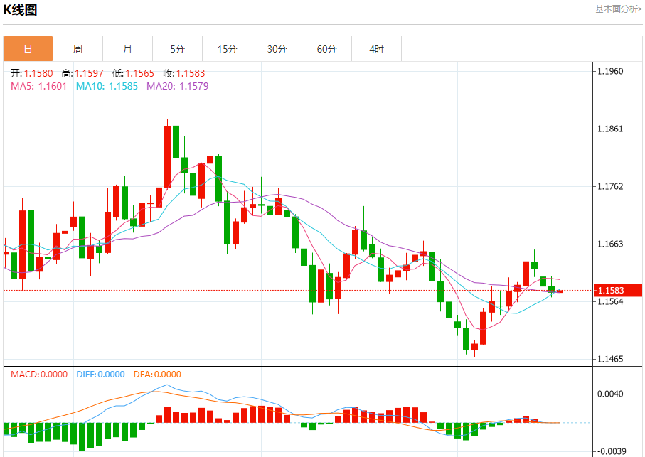 周三盘中,欧元/美元报1.1582,涨幅0.02%。