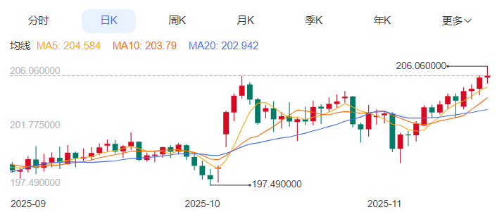 周四,英镑/日元上涨0.07%至205.39附近。