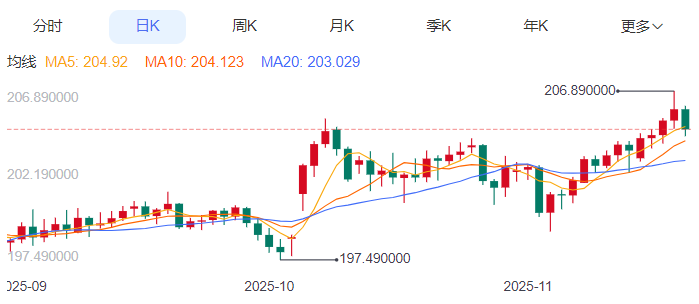 周五,英镑/日元下跌0.54%至204.76附近。