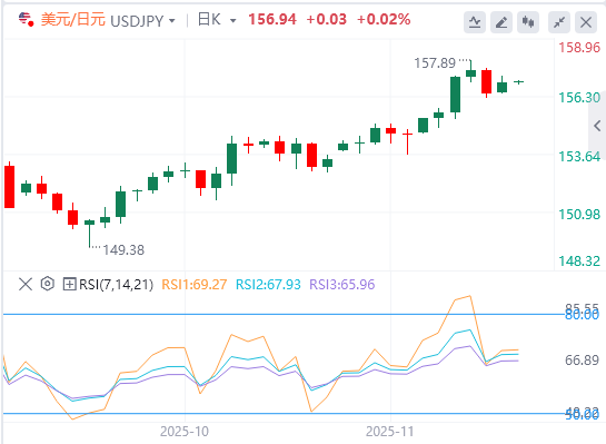 11月25日,美元/日元在周二亚洲早盘小幅上涨至约156.85。财政担忧和日本央行加息的不确定性对日元兑美元(USD)施加了一些卖压。周二晚些时候,美国ADP就业变化周报、零售销售和生产者价格报告将成为焦点。 由于市场预期日本首相高市早苗领导下政府支出增加,日元依然走弱。据路透社报道,高市上周批准了一项价值21.3万亿日元(1354亿美元)的经济刺激计划。该方案包括17.7万亿日元的一般账户支出,超过上一年的13.9万亿日元,是自新冠疫情以来最大的刺激措施。它还将带来价值2.7万亿日元的减税。这些政策引发了人们对日本财政健康状况恶化的担忧,并拉低了日元。 此外,日本央行因政治抵制提前紧缩政策而推迟加息的预期以及高市的亲刺激立场,可能加剧日元下行。路透社上周的一项民调显示,微弱多数经济学家预计日本央行将在12月将利率提高至0.75%,而许多市场参与者此前预计加息时间为12月或1月。 日元的下行空间可能有限,因为日本当局警告可能出现货币干预。日本财务大臣片山皋月表示,日本认为干预外汇市场是应对日元过于波动和投机性波动的可能。 投资者继续预计美联储将进一步降息。美联储行长克里斯托弗·沃勒周一发表鸽派言论,称现有数据显示美国就业市场仍然疲软,足以在12月的美国央行会议上再次降息四分之一个百分点。这反过来可能会削弱美元兑日元的汇率。根据芝加哥商品交易所FedWatch工具,美联储基金期货将下个月降息2.5个百分点的概率提高到80%,较美联储声明前的30%有所上升。 |