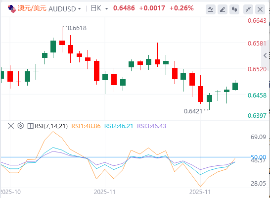 11月26日,澳元/美元上涨,连续第四个交易日的涨幅。澳元兑美元汇率在澳大利亚统计局(ABS)发布首个“完整”月度消费者物价指数(CPI)后保持稳固,该指数在十月同比上涨了3.8%。这一读数超过了市场共识的3.6%上涨和此前3.5%的上涨。 随着首个月度CPI加剧了澳大利亚储备银行(RBA)政策展望的谨慎情绪,澳元可能会走势。预计RBA将在12月将官方现金利率(OCR)维持在3.6%,因为通胀率仍高于RBA的2%至3%目标区间。澳储银行官员指出,失业率略有上升,但就业市场依然健康,预计将保持良好状态。 澳储银行11月会议纪要显示,央行可能会在较长时间内维持利率不变。ASX30天银行间现金利率期货显示,截至11月25日,2025年12月合约交易为96.41,这意味着在即将召开的澳大利亚储备银行董事会会议上,利率从3.60%降至3.35%的概率为6%。 芝加哥商品交易所FedWatch工具显示,市场目前预测美联储在12月会议上下调基准隔夜借款利率25个基点(bps)的概率超过84%,高于一周前市场定价的50%。 美国生产者物价指数(PPI)在9月份同比保持在2.7%,与预期及8月份数据一致,显示通胀压力已趋于稳定。核心PPI从2.9%降至2.6%,低于预期的2.7%。 美国零售销售9月环比增长0.2%,较8月份的0.6%增长放缓,显示消费者支出更加谨慎。另外,会议委员会报告家庭信心急剧下滑,消费者信心指数从10月的95.5下降6.8个百分点至88.7。 美联储行长克里斯托弗·沃勒周一告诉福克斯商业频道,他最关心的是劳动力市场的疲软,并补充说,鉴于近期就业疲软,通胀“不是大问题”。他还表示,9月份的就业数据可能会被下调,并警告集中招聘“不是好兆头”,表明他支持近期降息。 纽约联储行长约翰·威廉姆斯周五表示,政策制定者在“短期内”仍有可能降息,这一言论提升了市场12月加息的可能性。此外,美联储理事斯蒂芬·米兰表示,非农就业数据支持12月降息,并补充说如果他的投票决定性,他“会投票支持降息25个基点”。 澳大利亚标普全球制造业采购经理人指数(PMI)11月的初步读数为51.6,高于此前的49.7。与此同时,11月服务业PMI从前一读的52.5升至52.7,综合PMI从之前的52.1升至52.6。 澳大利亚储备银行上周公布了11月货币政策会议纪要,指出董事会成员表明采取了更为平衡的政策立场,并补充说如果新数据表现强于预期,银行可能会更长时间保持现金利率不变。 澳储银行助理行长莎拉·亨特上周指出,“持续的超预期增长可能会加剧通胀压力。”亨特指出,月度通胀数据可能波动较大,央行不会对单一月的数据做出反应。她补充说,澳储银行正在密切评估劳动力市场状况以评估供应能力,并研究货币政策的影响可能随时间变化。 澳元/美元技术分析 澳元/美元汇对周三交易价格约在0.6480附近。日线图分析显示该货币对处于矩形盘整区内,显示中性偏向。该货币对继续跌破九日指数移动平均线(EMA),显示短期动能受挫。 澳元/美元在矩形下限0.6420附近立即获得支撑,随后是8月21日记录的五个月低点0.6414。 上行方面,货币对徘徊在九天均线0.6479附近。若成功突破该水平,将支持澳元/美元对测试0.6500心理水平。进一步上涨将使该货币对接近矩形上界0.6630。 |