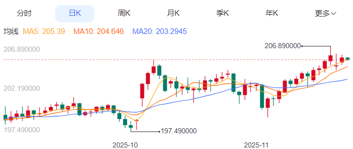 周二,英镑/日元下跌0.11%至205.41附近。