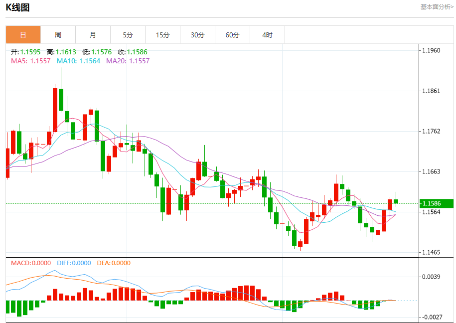 周四盘中,欧元/美元报1.1588,跌幅0.05%。