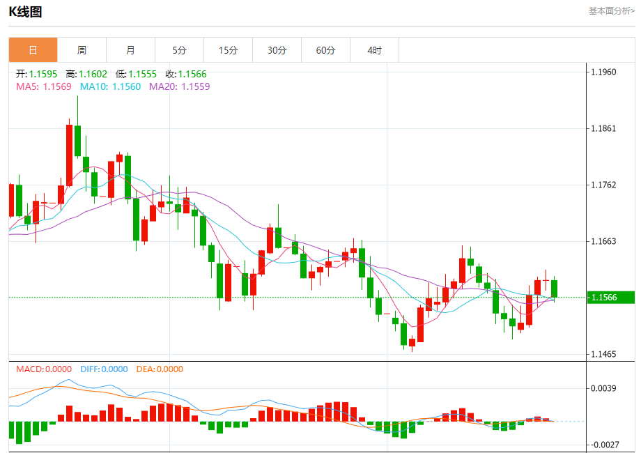 周五盘中,欧元/美元报1.1571,跌幅0.20%。