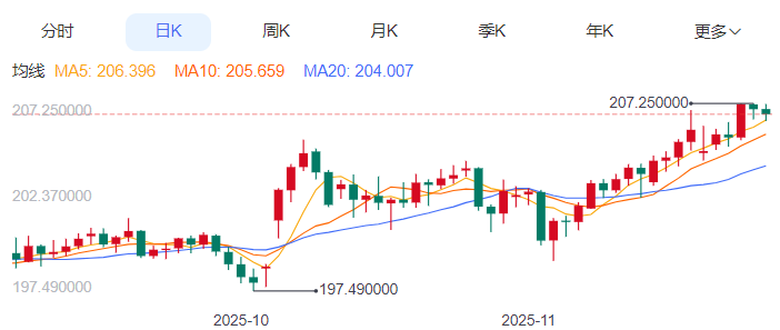 周五,英镑/日元下跌0.13%至206.68附近。