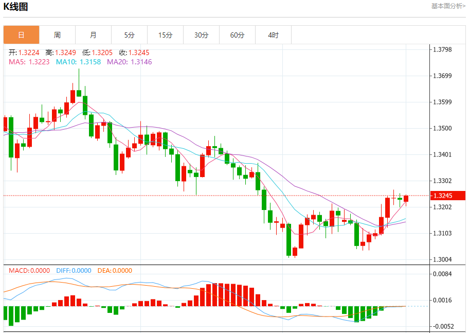 周一盘中,英镑/美元报1.3248,涨幅0.08%。