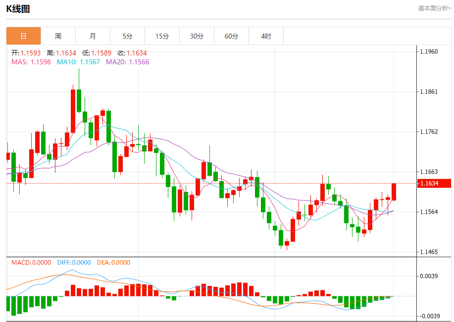 周一盘中,欧元/美元报1.1634,涨幅0.33%。