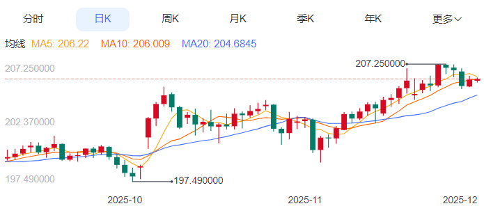 周三,英镑/日元上涨0.03%至206.02附近。