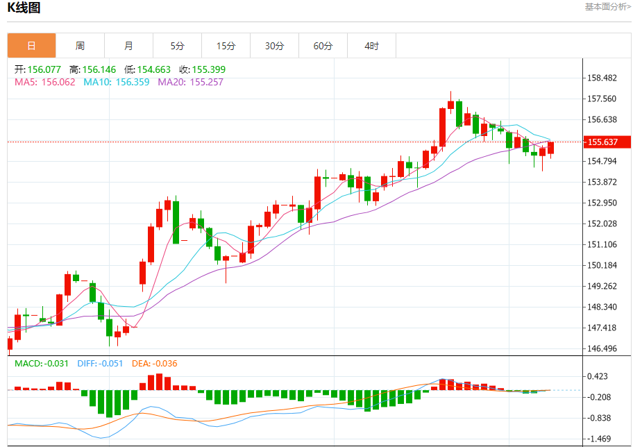 周一盘中,美元/日元报155.635,涨幅0.19%。