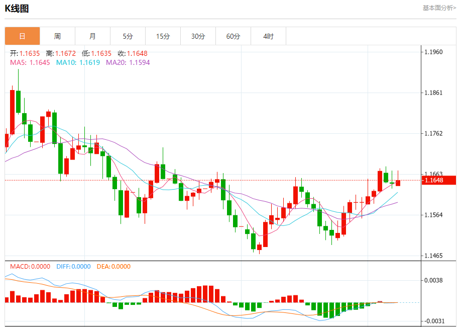 周一盘中,欧元/美元报1.1647,涨幅0.04%。