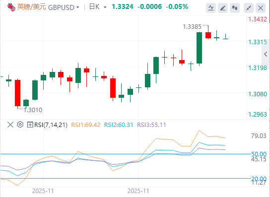 12月8日,英镑本周初对主要货币同行表现平稳,徘徊在1.3320左右,兑美元。在英国(UK)经济日历较为轻松的一周,英国货币预计将受到全球事件和市场对英格兰银行(BoE)货币政策展望预期的影响。 交易员们有信心,鉴于英国劳动力市场疲软和通胀放缓迹象,英格兰银行将在下周的政策会议上降息。截至9月的三个月就业市场数据显示,失业率上升至5%。与此同时,10月份消费者物价指数(CPI)报告显示,通胀率为3.6%,为四个月来的最低水平。 关于货币政策前景的更多线索,投资者将关注英格兰银行(BoE)外部成员艾伦·泰勒(Alan Taylor)于格林威治标准时间14:30发表的演讲。 周一欧洲交易时段,英镑兑美元在1.3320附近盘整。英镑兑美元在上周创下一个多月高点约1.3385后横盘,而美元在美联储周三公布货币政策前仍持谨慎态度。 芝加哥商品交易所FedWatch工具显示,美联储在周三政策会议上将利率下调25个基点(bps)至3.50%-3.75%的概率为87%。 美联储鸽派预期坚定的主要导火索是就业市场状况的减弱。11月底,纽约联储行长约翰·威廉姆斯也警告经济增长放缓和劳动力需求疲软,同时支持更多降息的必要性。威廉姆斯说:“经济增长放缓,劳动力市场逐渐降温,”并补充道,“短期内还有进一步调整的空间。” 随着交易员对美联储周三降息仍有信心,美元走势的主要导火点将是货币政策前景的指引。联邦公开市场委员会(FOMC)成员预计将在2026年初支持维持利率稳定,因为通胀压力数月来一直远高于2%的目标。 英镑/美元技术分析 周一,英镑/美元在1.3320附近持平。该货币对维持在上升的20天指数移动平均线(EMA)1.3227上方,保持近期正向偏向。20日均线近期有所上升,跌幅依然浅。 14天相对强弱指数(RSI)约在60点,反映出多头动能。 动能依然支撑,价格保持在上升的20日均线上方。若日收盘价位于50%斐波那契回撤位1.3402之上,将强化多头基调,并向10月17日高点1.3471开放空间。反之,若未能突破该障碍,货币对将继续盘整,回调将倾向38.2%斐波那契区域及1.3310趋势支撑。 |