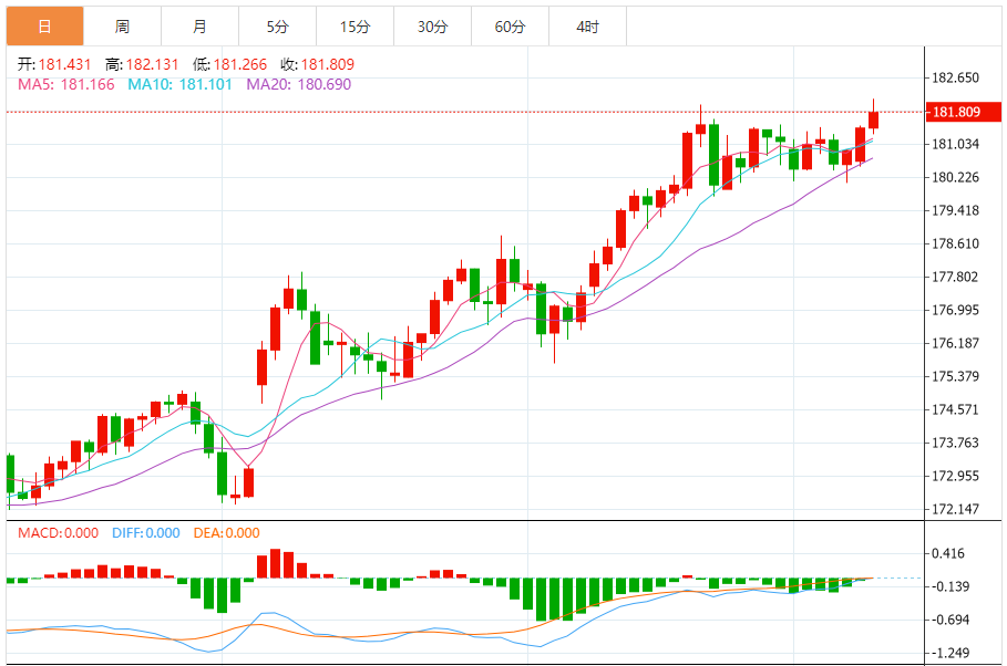 周二,欧元/日元上涨0.20%至181.836附近。