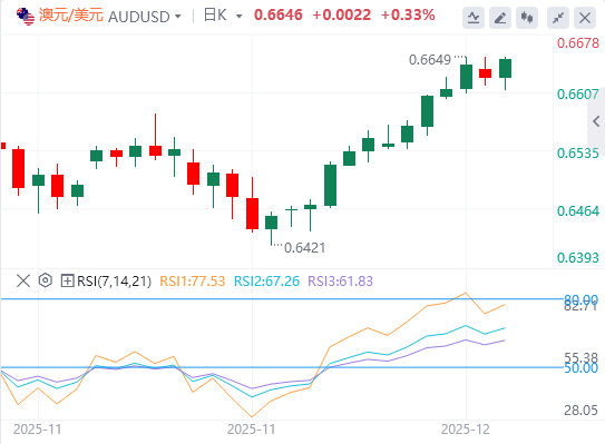 澳元因澳大利亚储备银行(RBA)行长米歇尔·布洛克在会后新闻发布会上的言论而出现新一轮买盘,布洛克称可能不需要更多降息。布洛克补充说,委员会讨论了央行可能采取紧缩措施的具体情况。这与美元(USD)小幅下跌一起,使澳元兑美元汇率回落至自9月18日以来的最高点,该水平于周一上涨,有利于看涨交易者。 然而,谨慎的市场情绪可能成为风险敏感的澳元在下一次关键央行事件风险前的阻力。美联储(Fed)计划于周三宣布决定,预计将再次降息,这使美元多头保持防守状态。与此同时,美联储的鸽派预期与澳储的前景形成了巨大分歧,支持了过去两周澳元/美元货币对上涨幅度的延长。 澳大利亚储备银行在本周二12月货币政策会议结束后,决定将官方现金利率(OCR)维持在3.6%不变。RBA在随附的政策声明中表示,董事会将关注数据以及不断变化的展望和风险评估,以指导其决策。 会后新闻发布会上,澳储行长米歇尔·布洛克表示,通胀和就业数据将在2月会议中发挥重要作用。布洛克补充说,看起来不需要更多降息,委员会讨论了如果需要加息可能采取的措施。 过去两周市场出现了显着的定价调整,澳大利亚储备银行目前已不再降息,因为价格压力持续存在。事实上,通胀率仍高于RBA2%至3%的年度目标,这也引发了人们对央行还有多少余地来放宽政策的疑问。 此外,澳大利亚储备银行行长米歇尔·布洛克上周表示,如果通胀持续存在,将对未来的货币政策产生影响。一些分析师甚至认为,如果国内经济状况稳健且通胀未降温,澳储储行可能已经结束了放松政策,甚至可能考虑在2026年前收紧政策。 美国商务部上周五报告称,9月份个人消费支出价格指数同比上涨2.8%,与预期相符。核心指标上涨2.8%,较8月份的2.9%上涨,加上美国劳动力市场降温的迹象,进一步确认了美联储的鸽派预期。 根据芝加哥商品交易所集团的FedWatch工具,交易员预计美国央行在周三为期两天的政策会议结束时,有近90%的概率将降低25个基点的借贷成本。这将限制美元从十月底以来最低点的温和反弹,并支撑澳元/美元汇率。 除了关键的央行事件风险外,交易者还将参考周二发布的两份美国劳动力市场报告——ADP每周就业变化和JOLTS职位空缺。随后,焦点将转向周三的FOMC决定以及预计周四发布的澳大利亚月度就业详情。 澳元/美元技术分析 澳元/美元在0.6615-0.6620阻力断点附近找到支撑。此外,日线图上的振荡指标稳固地维持在正区间,距离超买区还远,这验证了该货币对近期的积极前景。若周一突破0.6645-0.6650区间的后续买盘,或触及多月高点,将为挑战9月触及的0.6700点略高的年初至今高点铺平道路。 另一方面,跌破0.6600整数,可能被视为0.6560-0.6555附近买入机会。紧接着是100日简单移动平均线(SMA),约在0.6540-0.6535区间,澳元/美元可能在该区间下跌至0.6500心理关口,最终跌至0.6480水平区。未能守住上述支撑位将抵消积极前景,短期偏向看跌交易者,暴露出11月达到的0.6420附近多月低点。 |
