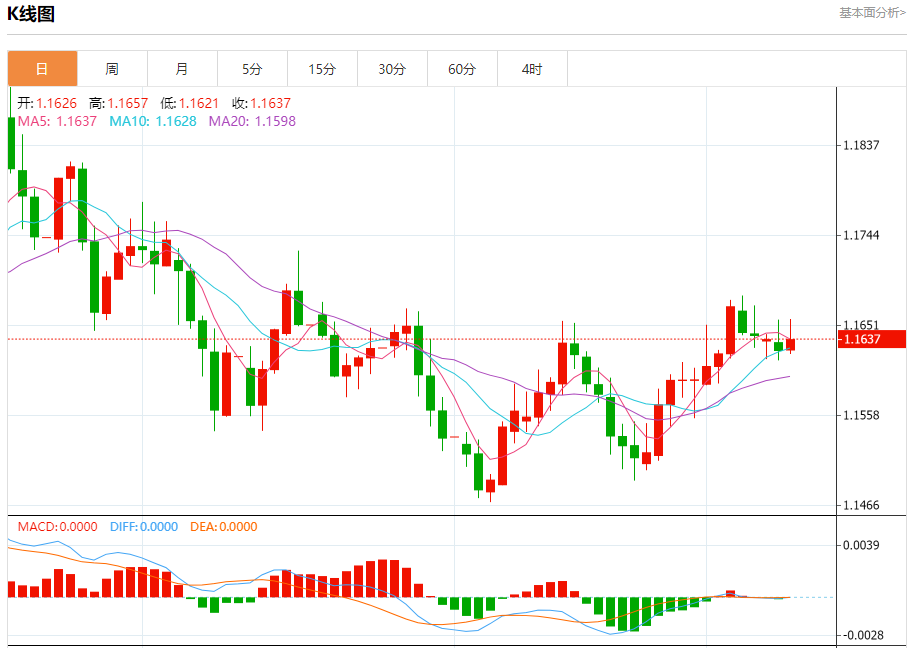 周三盘中,欧元/美元报1.1638,涨幅0.11%。