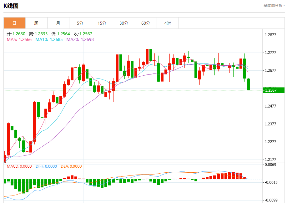 周一盘中,英镑/美元报1.2568,跌幅0.52%。