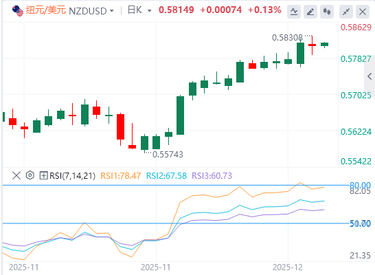 12月12日,纽元/美元汇对在周五亚洲早盘时段约0.5815附近处于正区间。美国就业数据低于预期,对美元兑纽元造成压力。美联储(Fed)官员将于当天晚些时候发表讲话,包括贝丝·哈马克和奥斯坦·古尔斯比。 美国劳工部(DOL)周四披露,截至12月6日当周,美国每周失业救济申请人数上升至23.6万件。该数字高于市场共识的22万,高于前一周的19.2万(从19.1万修正)。这一读数创下自2021年7月中旬以来的最大涨幅,并对美元(USD)造成一定抛售压力。 美联储周三决定将基准利率下调2.5个百分点,将目标区间调整至3.50%至3.75%。这是今年连续第三次晋级。美联储主席鲍威尔在新闻发布会上表示,美国央行现在“处于良好位置,可以观望经济的发展。”美联储官员预计2026年将再降一次四分之一个百分点的利率。 新西兰储备银行(RBNZ)在11月会议上将官方现金利率(OCR)下调25个基点(bps),至2.25%。新西兰央行表示,未来的利率变动将取决于经济和通胀前景,分析师认为降息周期目前可能已经结束。这反过来可能为新西兰兑美元提供一定支撑。 |