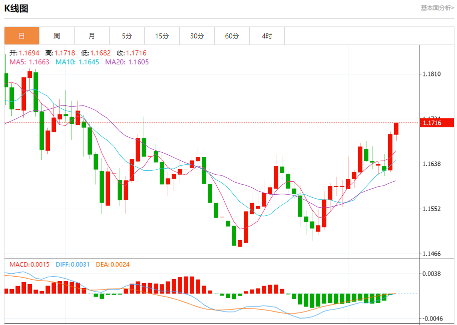 周四盘中,欧元/美元报1.1717,涨幅0.20%。