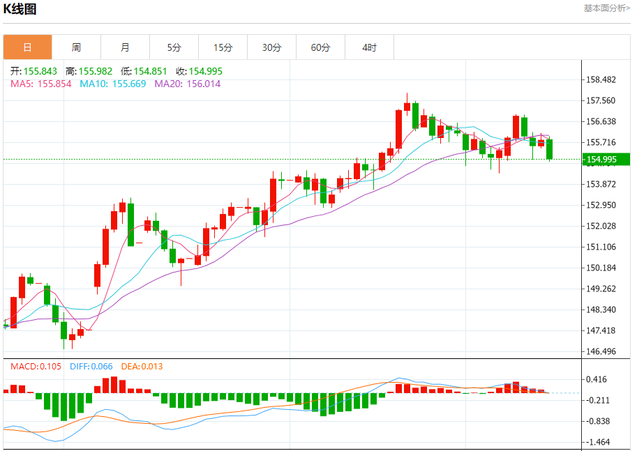 周一盘中,美元/日元报154.990,跌幅0.53%。
