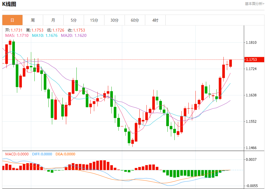 周一盘中,欧元/美元报1.1753,涨幅0.11%。
