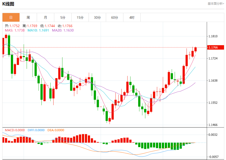 周二盘中,欧元/美元报1.1766,涨幅0.12%。
