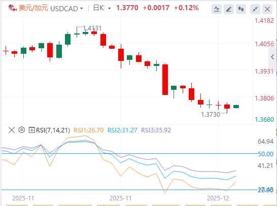 12月17日,美元/加元自前一交易日创下的三个月低点1.3730反弹,周三亚洲时段交易时段目前交易约为1.3770。随着美元(USD)获得支撑,这对货币对有所回升,因为劳动力市场数据混合,未能强化美联储进一步降息的预期。 美国11月就业报告显示,就业增长为6.4万人,略高于预期,但10月数据被大幅下调,失业率上升至4.6%,为2021年以来最高,凸显劳动力市场逐渐降温。零售销售按月持平,进一步强化了消费者需求失去动力的迹象。 美联储官员们对明年是否需要进一步放宽货币政策存在分歧。美联储官员的中位数预计2026年仅会有一次削减,但一些政策制定者认为不会有进一步的削减。与此同时,交易员预计明年将有两次降息。 据《华尔街日报》报道,美国总统唐纳德·特朗普将于周三面试美联储理事克里斯托弗·沃勒,担任美联储最高主席职位。《华尔街日报》10月的一项民调显示,沃勒被评为经济学家的首选,因为“他提出了今年降息最有理性且最一致的论点之一,被视为可能驾驭内部分歧的人选。” 随着加拿大央行决定维持2.25%利率并认为政策“大致处于合适水平”,美元兑加元可能继续下跌,削弱了对近期激进宽松的预期。 与此同时,加拿大通胀数据显示整体CPI稳定在2.2%,平均通胀回落至十个月低点2.8%,强化了人们对价格压力正趋近央行目标的信心。 |