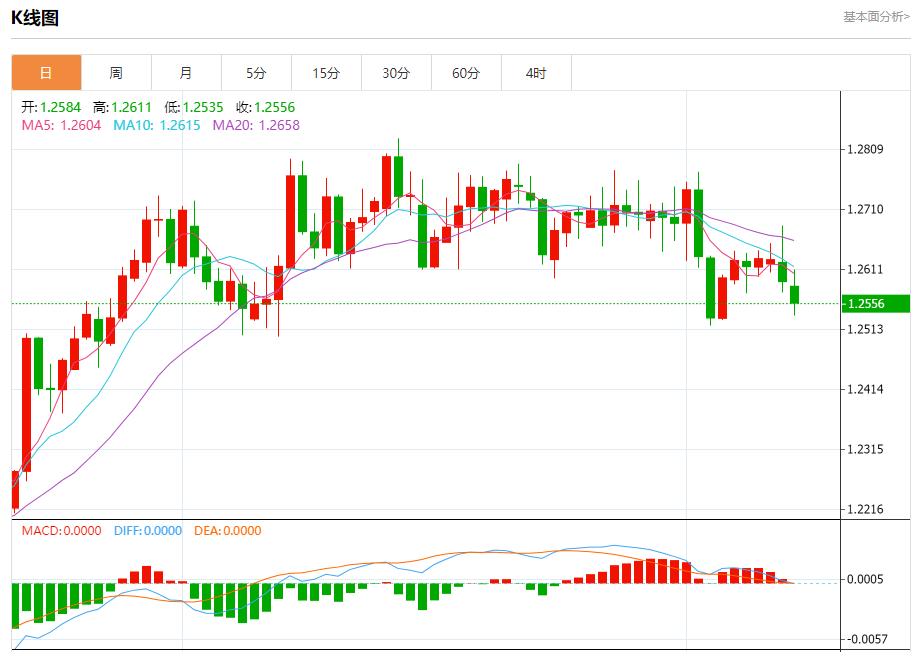 周三盘中,英镑/美元报1.2556,跌幅0.29%。