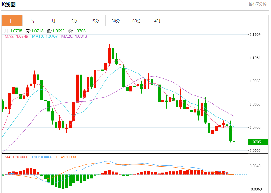 周三盘中,欧元/美元报1.0706,跌幅0.03%。