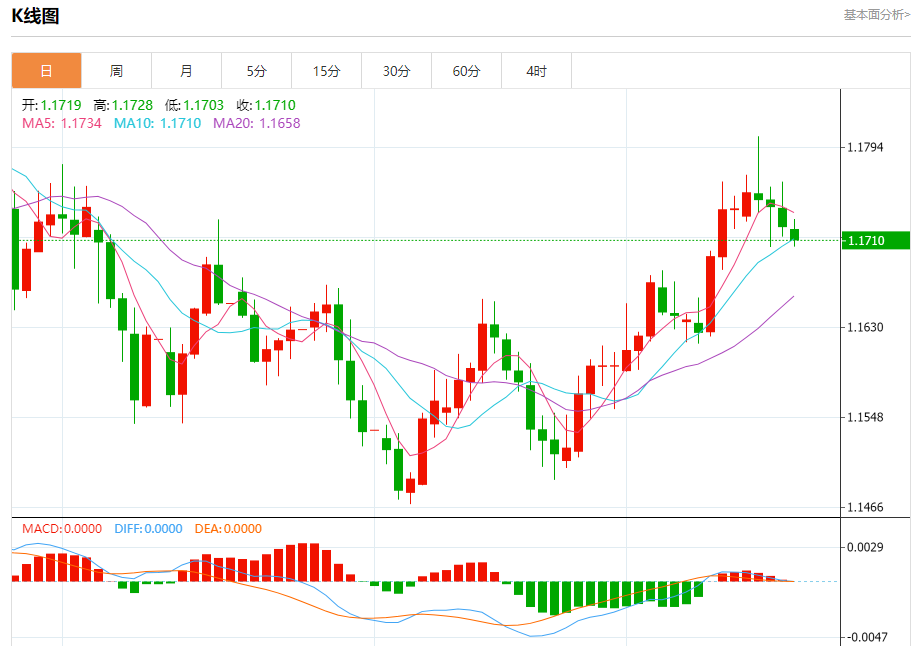 周五盘中,欧元/美元报1.1710,跌幅0.09%。