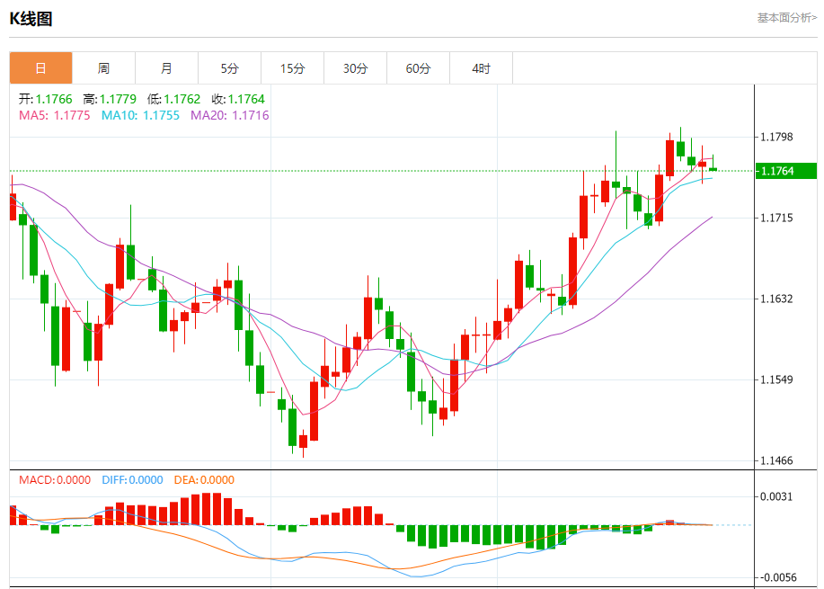 周二盘中,欧元/美元报1.1763,跌幅0.08%。