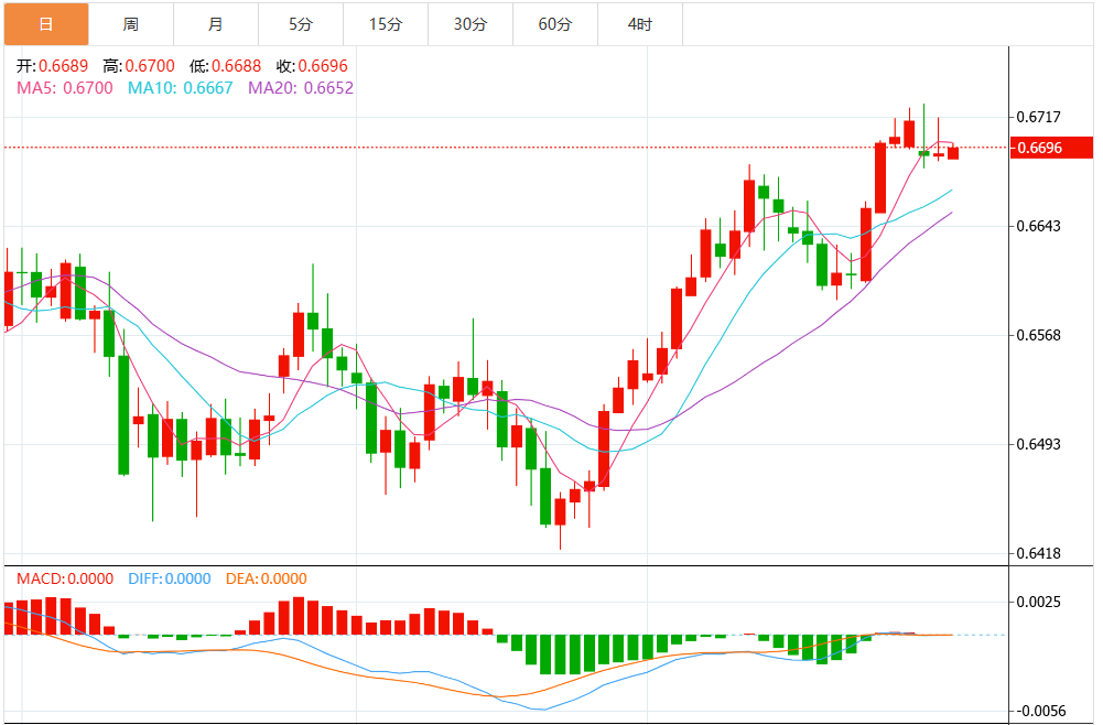 周二,澳元在周二的回升在0.6740区域受限,汇率在欧洲时段回落至0.6715区域,截至发稿时,日图几乎持平。 |