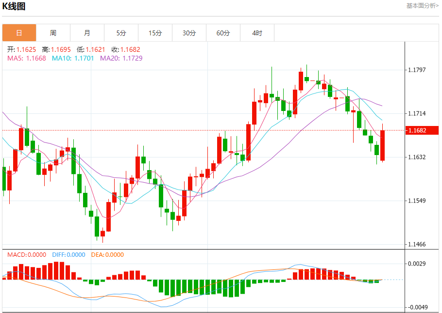 周一盘中,欧元/美元报1.1682,涨幅0.40%。