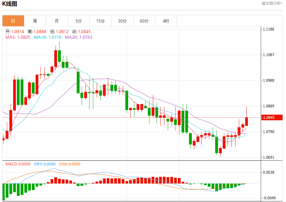 周四盘中,欧元/美元报1.0846,涨幅0.24%。